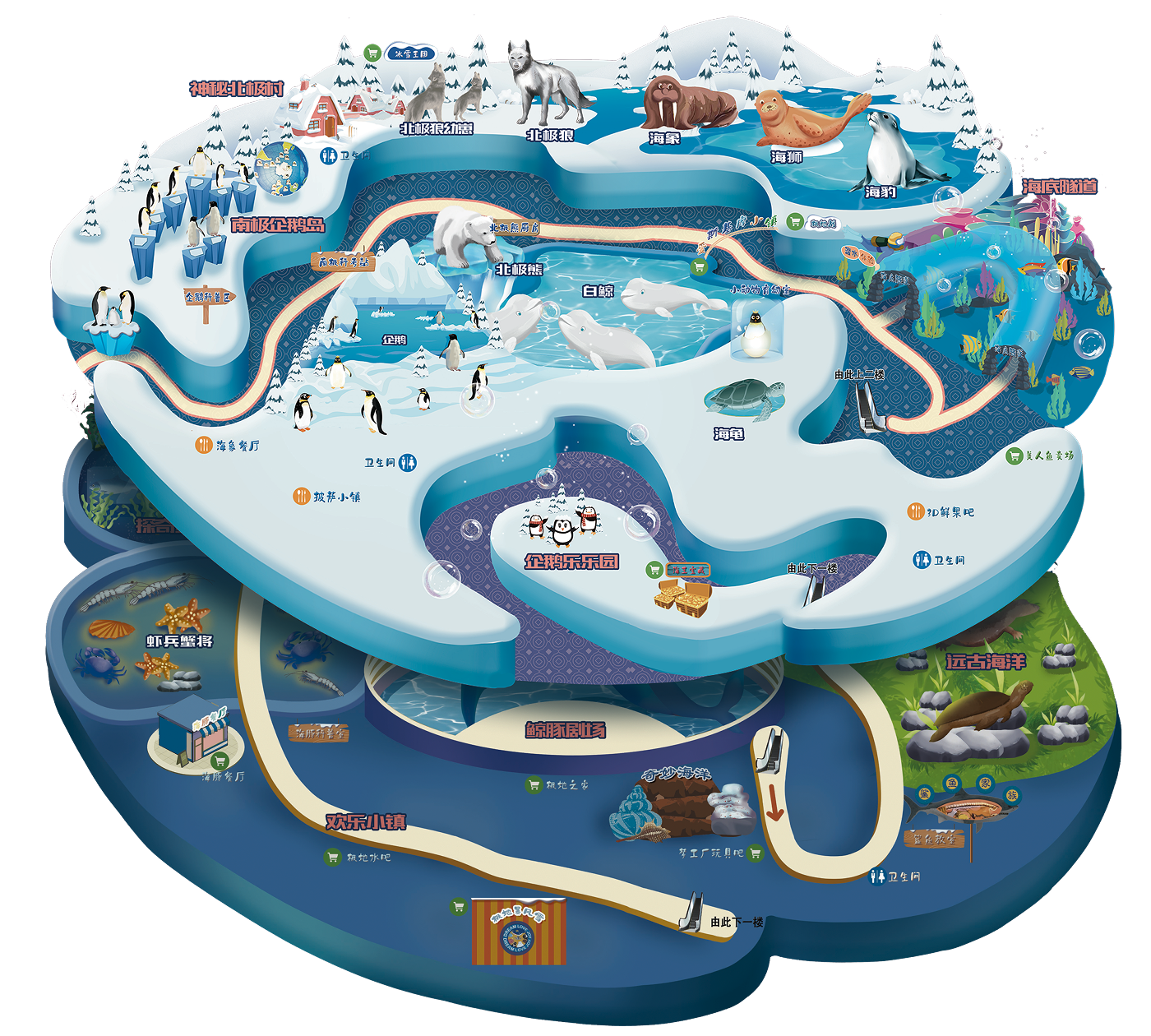 地图将展区赋予了故事化的名称,增加产品的文化附加值,让单纯的“看鱼”变成一场“探险”,提升游客的体验感和满意度。生动形象的层级地图