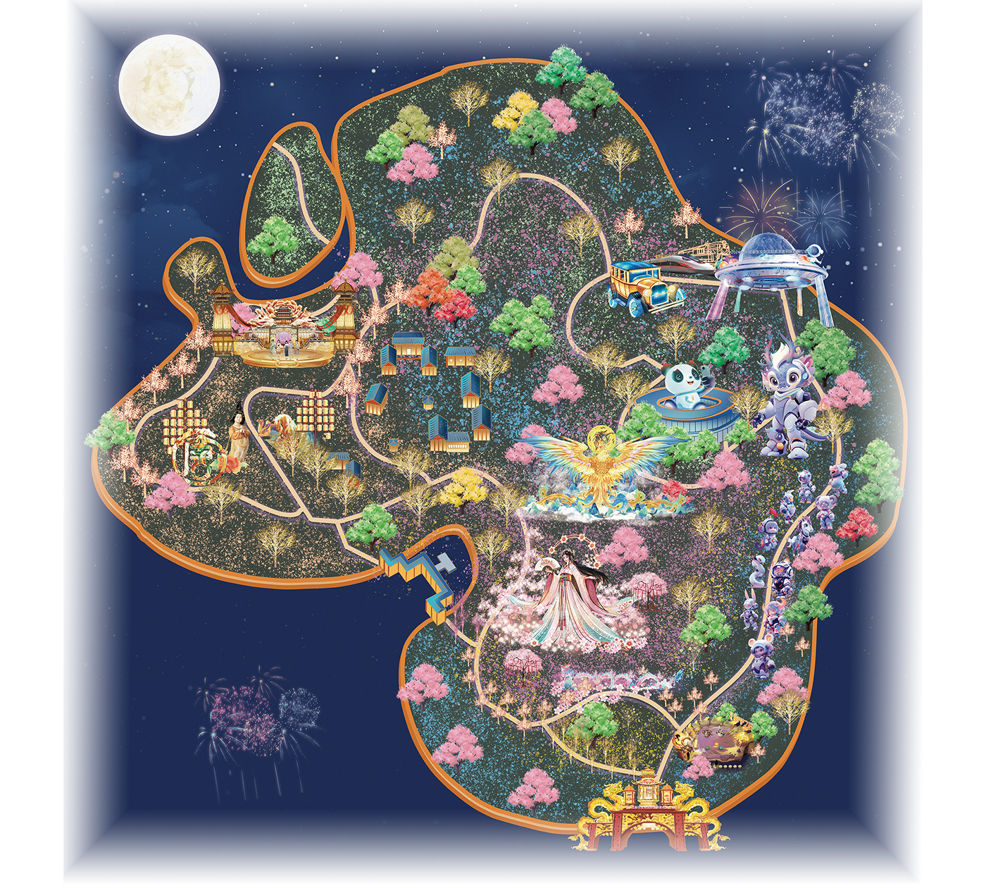 左上角的圆月和右侧的烟花,为游客渲染一种“圆满”、“浪漫”的场景暗示,非常适合情侣约会和家庭出游的定位。