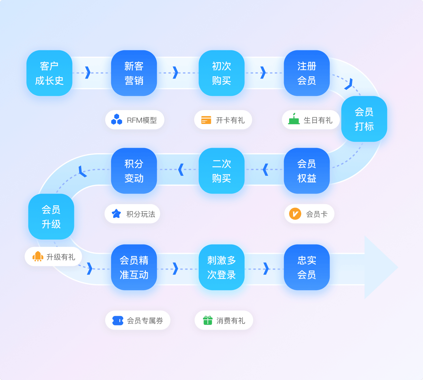 - 数据驱动的会员运营提供会员增长、活跃、消费及留存等多维度数据分析看板